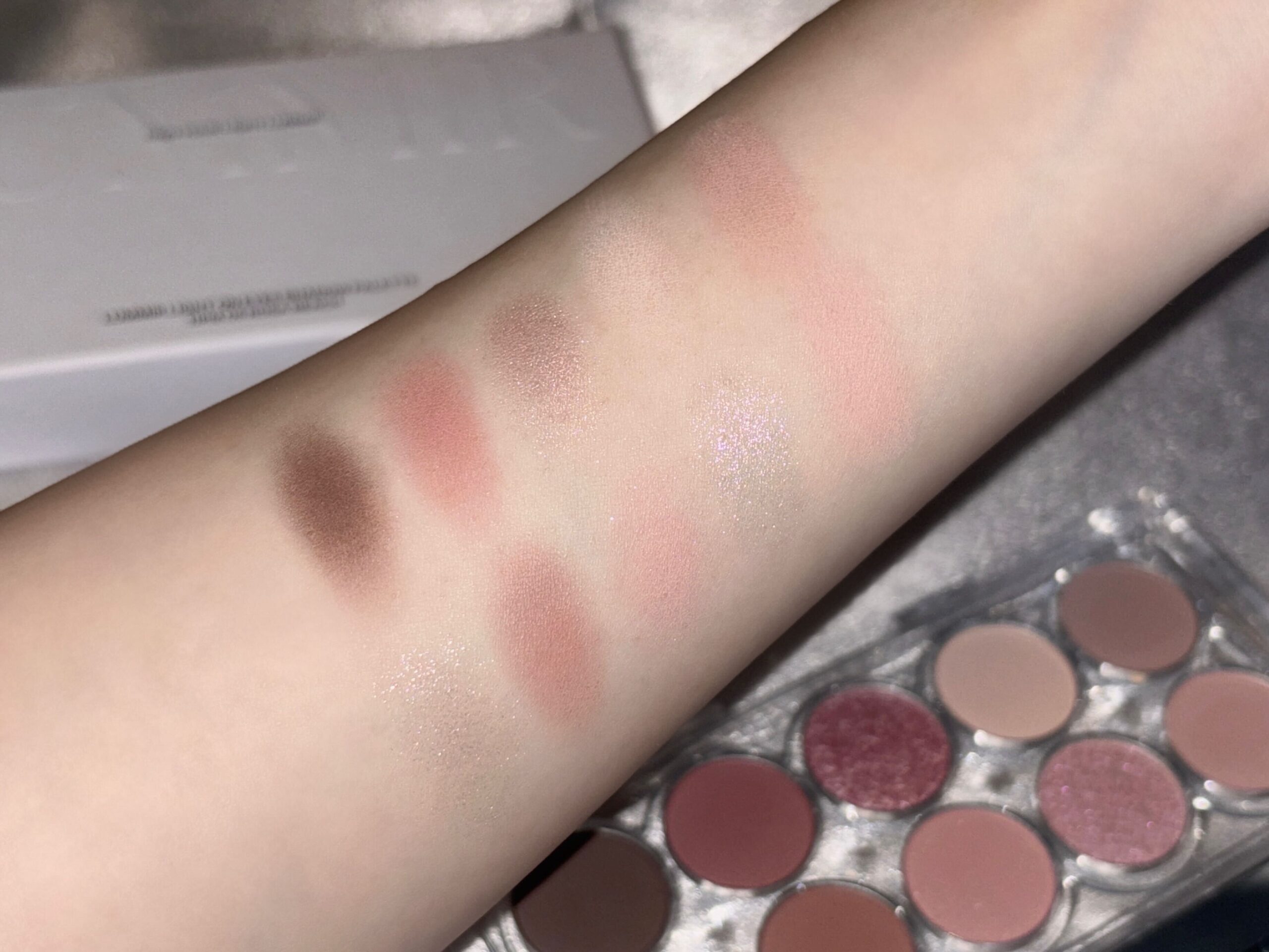 肌に乗せてみると青みに寄りすぎないローズカラーと黄みに寄りすぎないニュートラルなブラウンでぱっと華やかになりました。